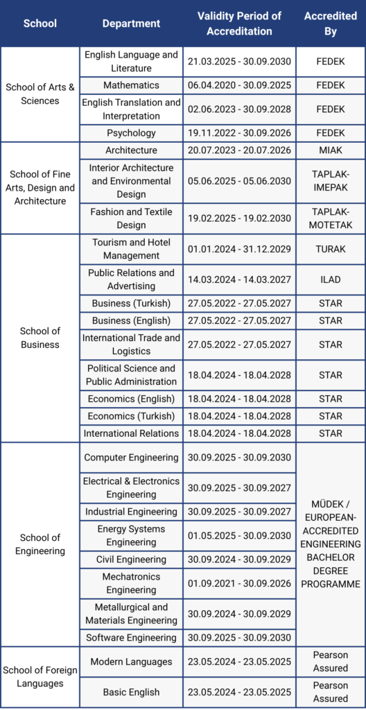 | School of Engineering | Computer Engineering | 30.09.2025 - 30.09.2030 | MÜDEK / EUROPEAN-ACCREDITED ENGINEERING BACHELOR DEGREE PROGRAMME | Download | View |