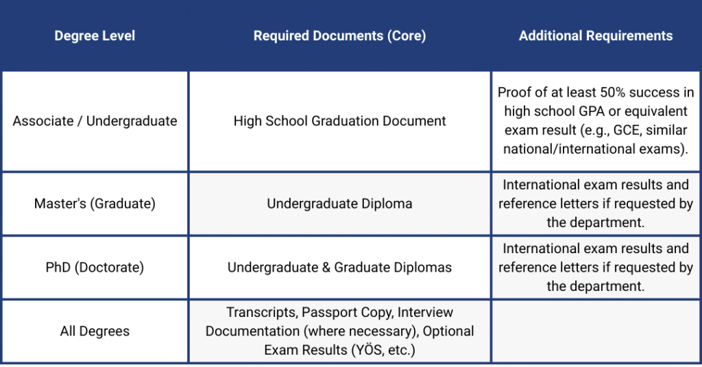 | All Degrees | Transcripts, Passport Copy, Interview Documentation (where necessary), Optional Exam Results (YÖS, etc.) |