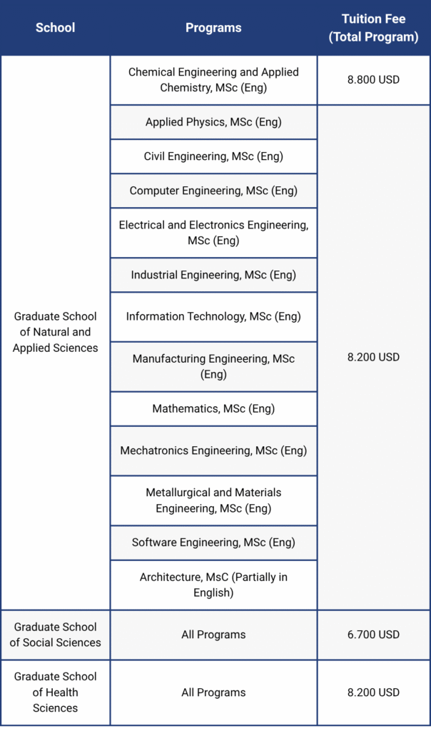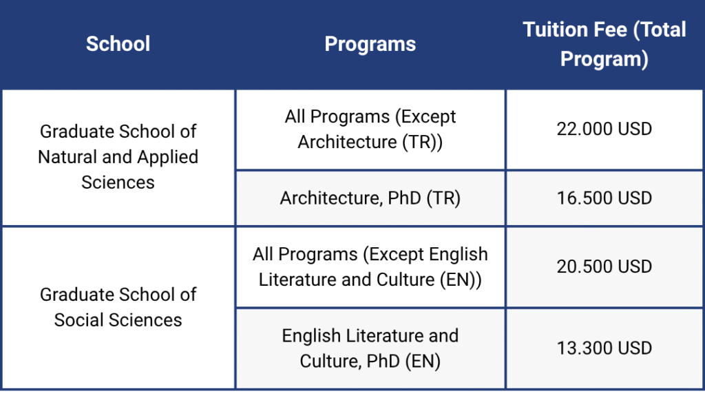 | Graduate School of Natural and Applied Sciences | All Programs (Except Architecture (TR)) | 22.000 USD |