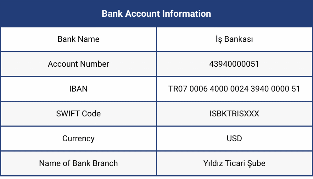 Important: The account number provided on this page is for international candidate students only, for pre-registration purposes. The account should not be used by our international students after registration. Students having to pay their tuition fee via wire transfer to the account provided after registration (for payments from outside of Türkiye) should write their student number in the “Details” section for the transfer. Registered international students will be able to pay easily via İşbank (İş Bankası) online.
